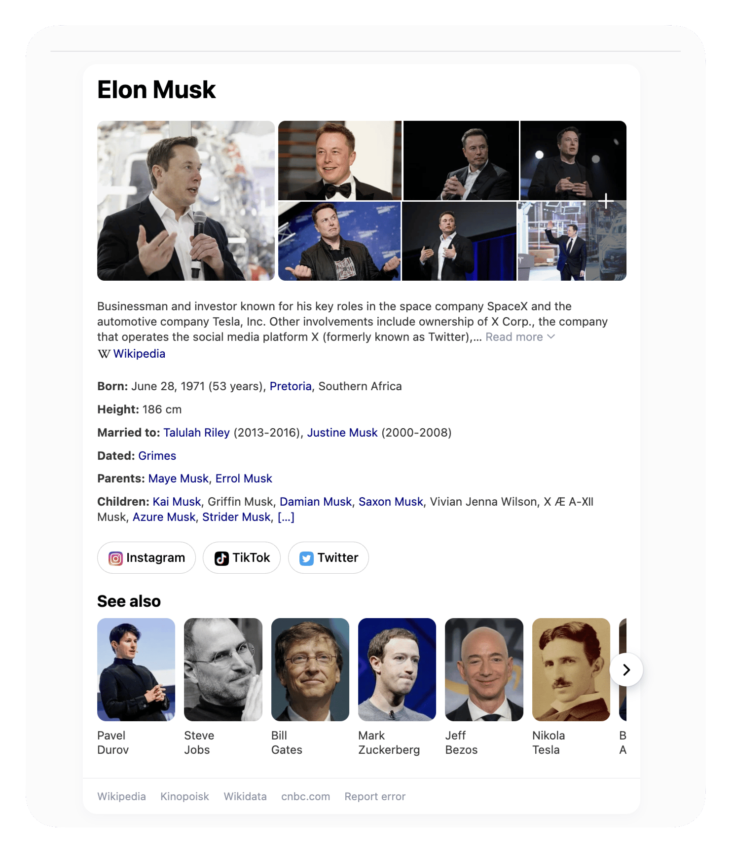 - Knowledge Graph – Entity cards with title, description, source (name/link), attributes (e.g., birth date, height, relationships), profile links, and images.